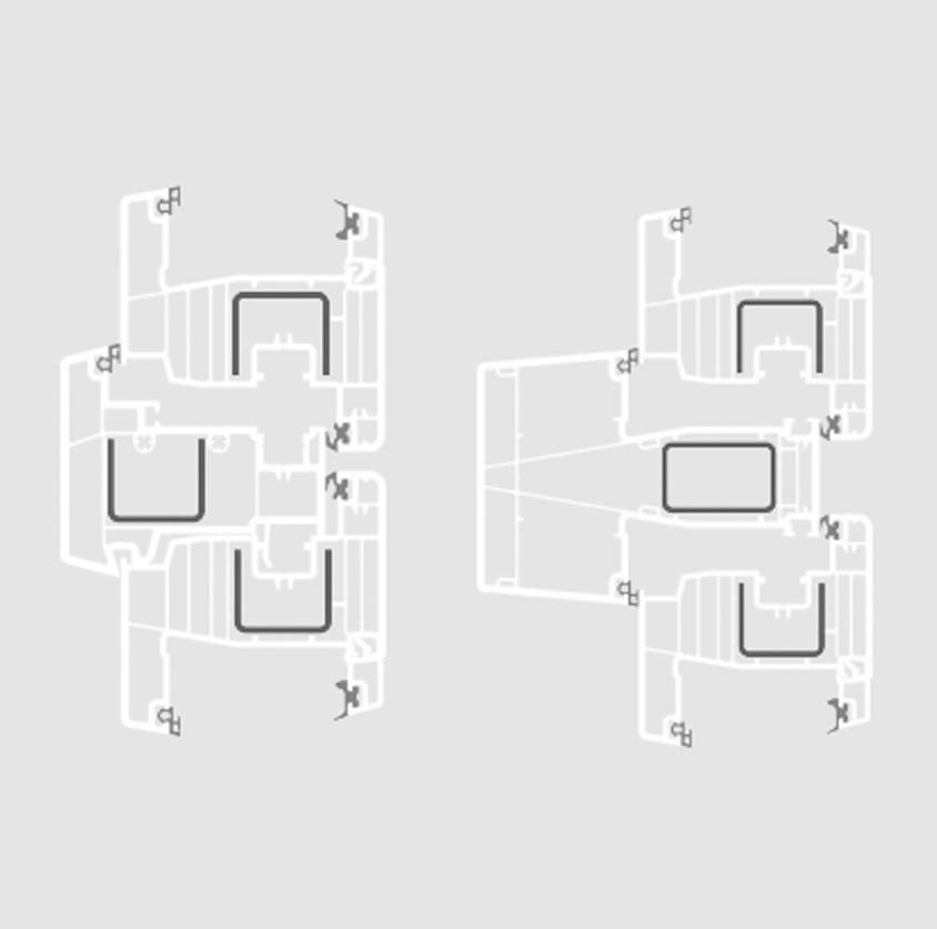 • Meerkamerconstructie met 3-voudige afdichting. De profielopbouw bestaat uit meerdere isolerende kamers en een drievoudig afdichtingssysteem met lasbare dichtingen. Dit verbetert de warmte-isolatie en verhoogt de lucht- en waterdichtheid.