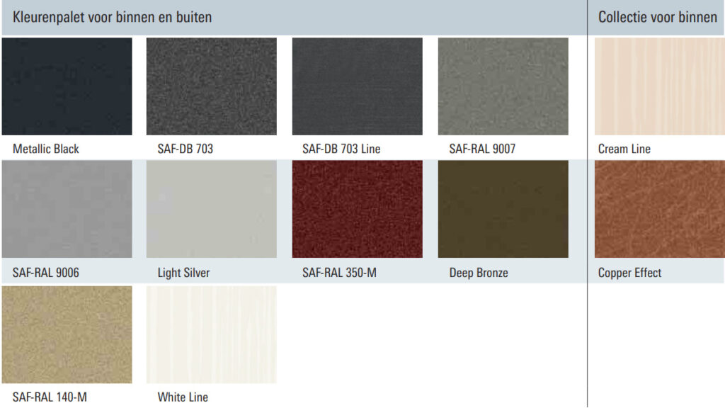 Veiligheid: Met een constructiediepte van circa 120 mm en een dieper liggend beslag biedt het systeem uitstekende weerstand tegen inbraak. In combinatie met SKG**-gecertificeerd hang- en sluitwerk voldoet het aan de eisen van het Politiekeurmerk Veilig Wonen.